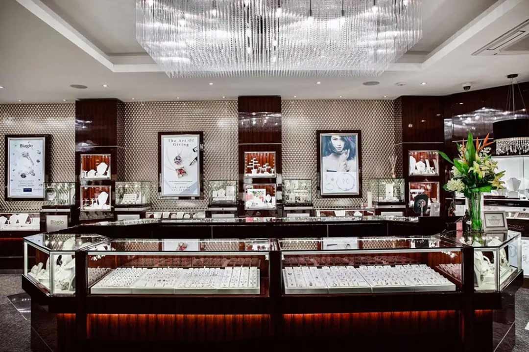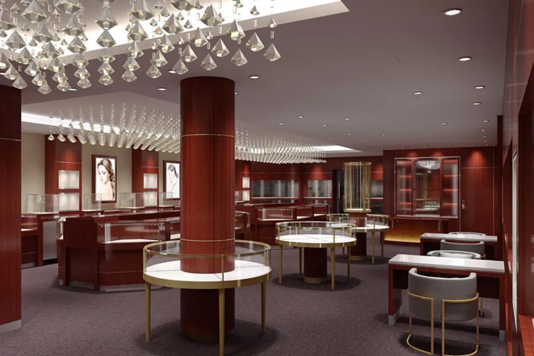 This jewelry store interior design comprehensively considers the display needs of Biagio, the circulation of personnel, as well as the beauty and comfort in the space. We use two hidden doors, and two couple of round showcases envelop the columns to meet the circulation of the space and the appearance of decoration, Aesthetics